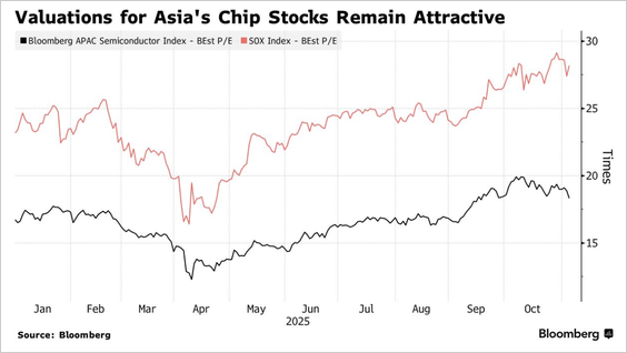- Bloomberg’s APAC Semiconductor Index trades at around 18 times forward earnings, well below the Philadelphia Semiconductor Index’s 28 times.