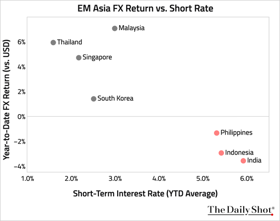In EM Asia, higher-yielding currencies have underperformed lower-yielding ones this year.