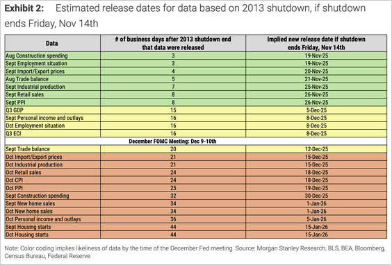 - Here's Morgan Stanley's estimates of when different economic data will be released, assuming the government shutdown ends this Friday.