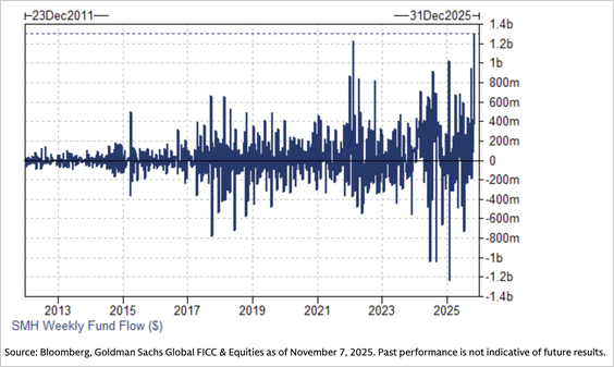 - Semiconductor flows were robust, especially in SMH (VanEck Semiconductor ETF), which saw the strongest weekly inflow since the fund’s 2011 inception.