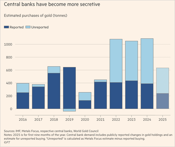 - China’s unofficial gold purchases are likely far higher than reported, with analysts estimating up to about 250 tonnes this year—more than 10 times the official tally.