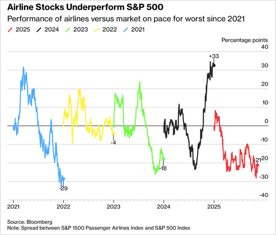 - US airline stocks face renewed pressure as the record government shutdown and persistent air-traffic-controller shortages drive thousands of flight cancellations.