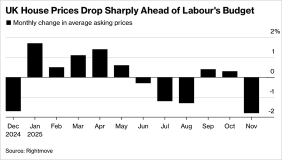 - Sales of homes priced above £2 million fell 13% Y/Y, far outpacing the broader 5% decline in housing transactions, amid speculation of a potential “mansion tax” in the upcoming budget.