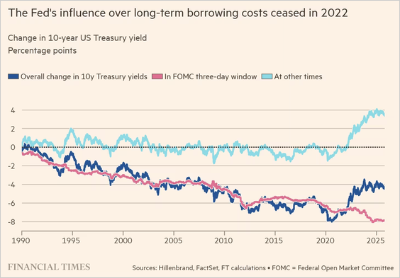- The Fed’s long-run influence over 10-year Treasury yields appears to have faded since 2022, with most of the rise in yields now occurring outside FOMC meeting windows.