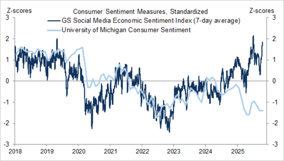 Social media sentiment, on the other hand, has remained buoyant, meaningfully diverging from survey-based consumer sentiment.