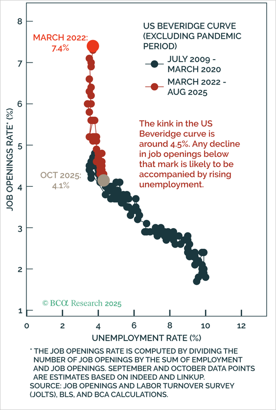 Real-time proxies suggest the job openings rate fell to 4.1% in October, below the 4.5% “kink” in the Beveridge curve flagged by Fed Governor Waller—implying further declines in openings could begin to lift unemployment more noticeably.