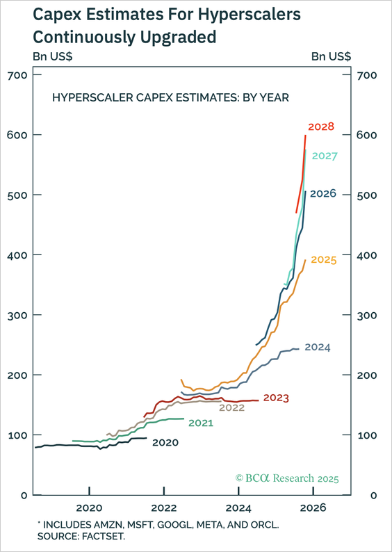 - The AI boom continues to fuel investment, with analyst estimates and company plans pointing to rising AI-related capex well into next year.