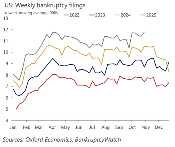 - A key driver of small-business weakness is the pandemic-era surge in new business formation: younger firms naturally fail at higher rates, and the sustained wave of startups since 2020 is now producing a sustained rise in bankruptcies.