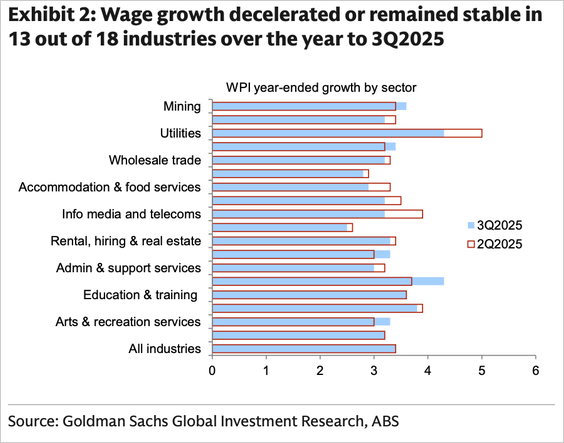 Wage growth decelerated in 13 of 18 industries, indicating a broad-based cooling in private pay pressures.