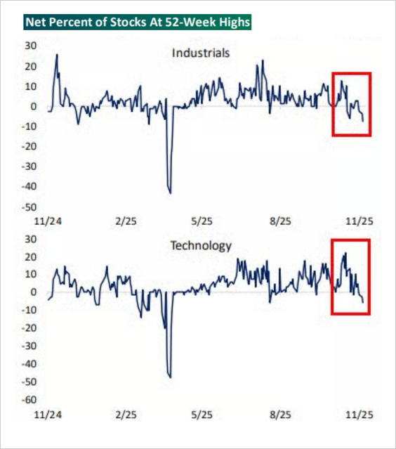 - There are now more 52-week lows than 52-week highs for both Industrials and Technology.