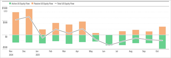 - US equity funds saw a sixth straight month of outflows in October. Weak passive inflows and persistent active outflows remain key drivers.