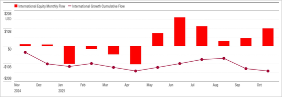 International equity funds saw a sixth straight month of inflows in October, driven entirely by passive inflows that offset active outflows. Growth-oriented international funds remain under pressure.