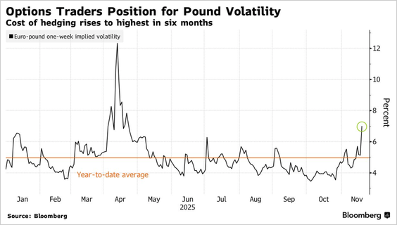 - Traders are paying elevated premiums for short-dated sterling options ahead of the November 26 UK Budget, with euro-pound vols hitting six-month highs.