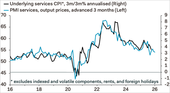 Underlying services inflation rose on a year-over-year basis but slowed on a 3-month-over-3-month basis. PMI suggests further easing ahead.
