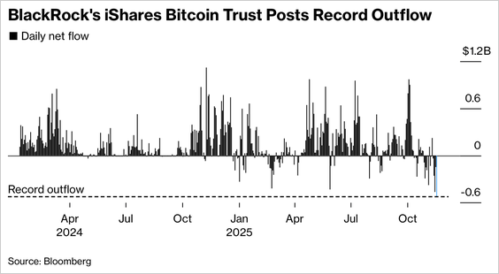 - BlackRock’s IBIT saw a record single-day outflow as Bitcoin slumped nearly 30% from its October peak.