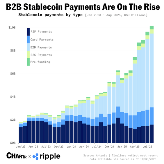 - The volume of B2B transactions using stablecoins has risen 40-fold over the past two years.