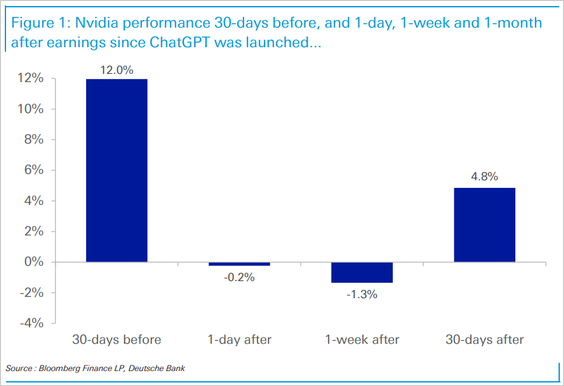 Since the launch of ChatGPT, Nvidia's stock performance has been strong in the month before earnings, while its average performance one day and one week after earnings has been slightly lower.