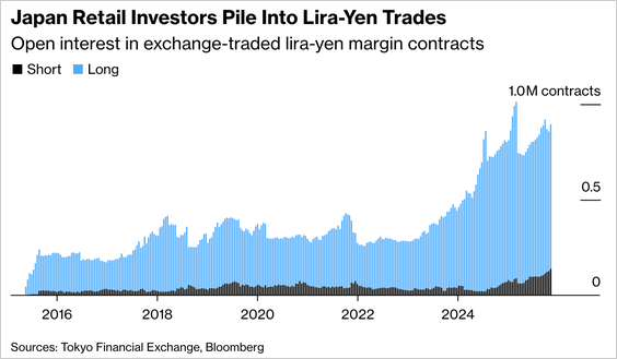 - Japanese retail investors are aggressively piling into high-yield lira-yen carry trades, pushing margin contract open interest near record highs.