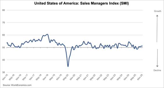 - The US SMI from World Economics edged up to 51.1 in November, indicating subdued but positive growth.