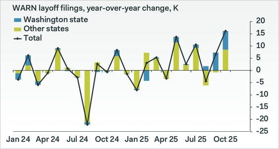However, the jump was driven largely by Washington State’s new “mini-WARN” law, alongside genuine layoffs at Amazon and Starbucks. Excluding Washington, WARN filings rose more moderately, indicating a gradual, not alarming, deterioration in layoff trends.