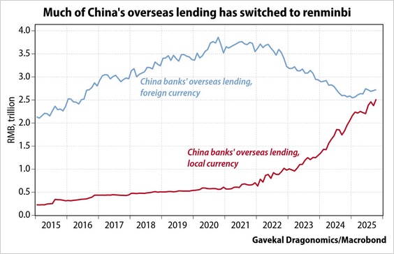 - China’s renminbi lending overseas has exploded to around 2.5 trillion yuan, about three times more than at the end of 2021.