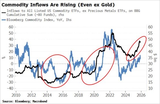 - Commodity inflows to ETFs have been steadily rising and are approaching the highs they reached in 2022.