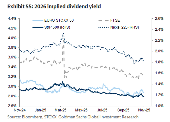- S&P 500 implied dividend yield is low relative to both its own history and other regions.
