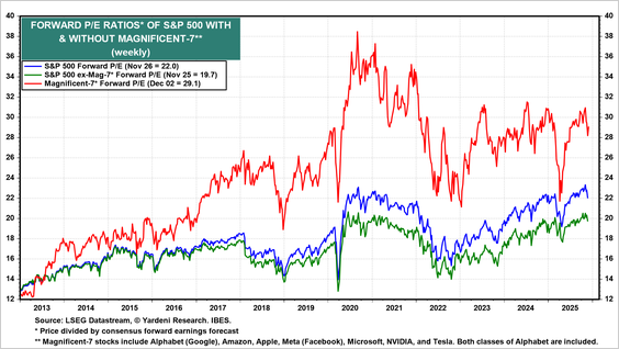 Mag 7 forward P/E is 48% higher than that of other S&P 500 members, suggesting the market continues to extrapolate the success of the largest companies forward.