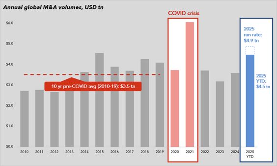- The year 2025 is on pace to rank as the second best in global M&A volume.