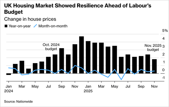 - House prices rose 0.3% in November, marking a third consecutive monthly gain and outperforming expectations despite pre-budget tax concerns.