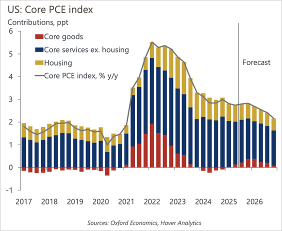 - Core inflation will return close to the Fed’s target by the end of 2026, according to Oxford Economics.