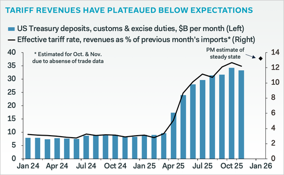 - Average effective tariff rate declined from 12.7% to 12.2% in November, well below the headline numbers. Substitution away from China, greater use of USMCA provisions, and a surge in tariff-exempt imports have all pushed the effective tariff rate lower.