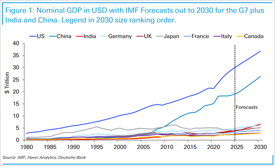 - The US economy, in nominal GDP terms, is expected to remain approximately 40% larger than China’s economy by 2030, according to IMF projections. India is expected to pass Japan for fourth place next year, and then surpass Germany in 2028–2029 to claim third place.