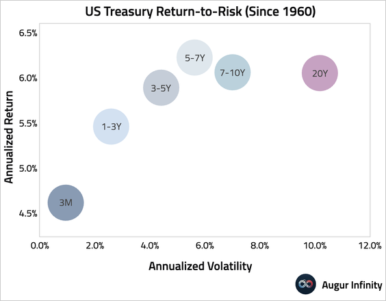 - Duration extension—buying longer-term bonds—is not always rewarded. Since 1960, investors have gotten incrementally better returns when moving from cash to short- and intermediate-term bonds. However, buying seven- to twenty-year bonds would have yielded lower returns than five- to seven-year bonds, with more volatility.