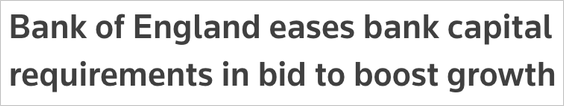 - The Bank of England lowered its benchmark Tier 1 capital requirement for lenders to 13% from 14%, marking the first easing since the financial crisis as policymakers seek to support credit growth.