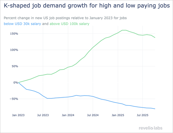 - Job openings for high-wage roles have surged roughly 150% over two years but stalled in 2025, while postings for low-wage jobs have fallen more than 50% since early 2023.