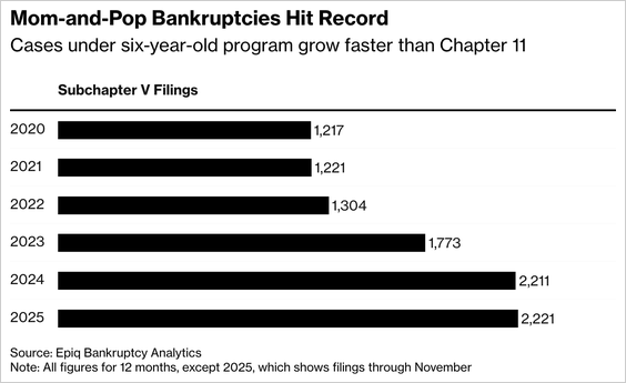 - Subchapter V bankruptcies in the first eleven months of this year have already surpassed the full-year total for last year, as small businesses face high borrowing costs, softer consumer demand, and trade-war pressures.