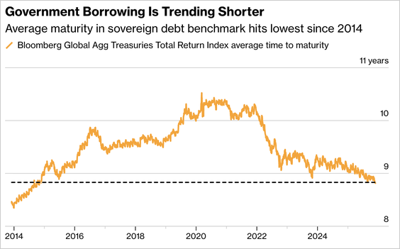 - The average maturity of government bonds has fallen to the lowest since 2014, as governments are increasingly shifting toward short-term debt.