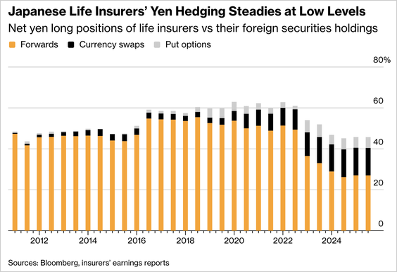 - Japan’s life insurers kept yen-hedging ratios near a 13-year low in the fiscal first half, covering just 45.7% of overseas portfolios as lower hedging costs failed to spur a shift.