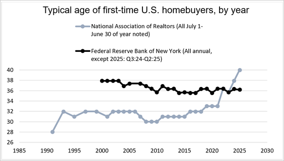 - The National Association of Realtors’ report that the median first-time homebuyer age has risen to 40 captured headlines, but Federal Reserve credit-panel data show the age is 36 and stable, according to AEI Housing Center analysis.