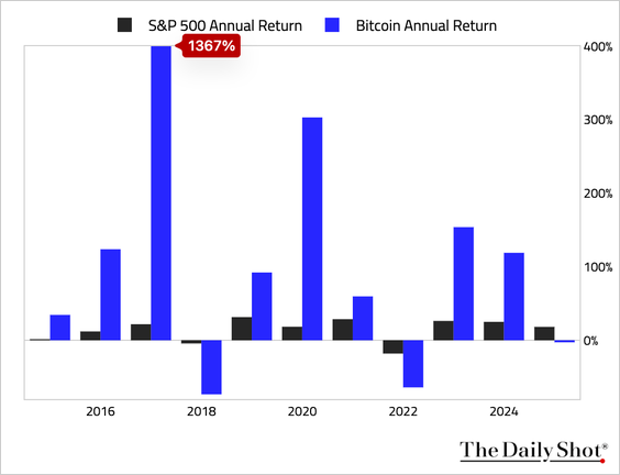 Bitcoin is down year to date, while the S&P 500 is up. The last time this happened was 2015.