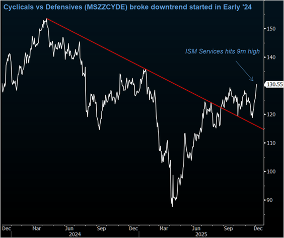 - Cyclicals versus defensives have been on a strong run.
