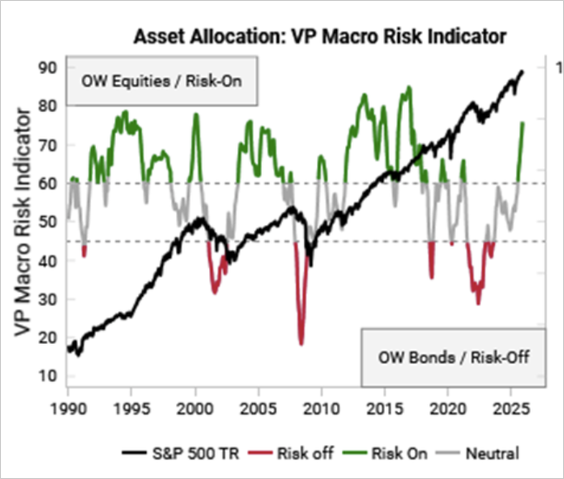 - Variant Perception’s Macro Risk Indicator remains in “risk-on” territory.