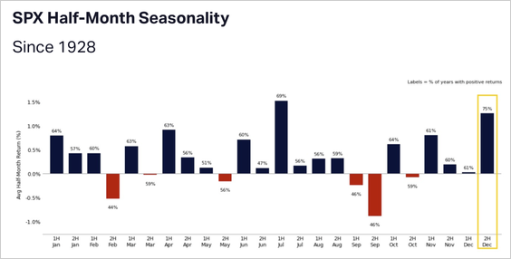 - Seasonality has turned supportive, as the S&P 500 has risen during the second half of December in 75% of past years, delivering an average gain of 1.3% (2.1% when positive).