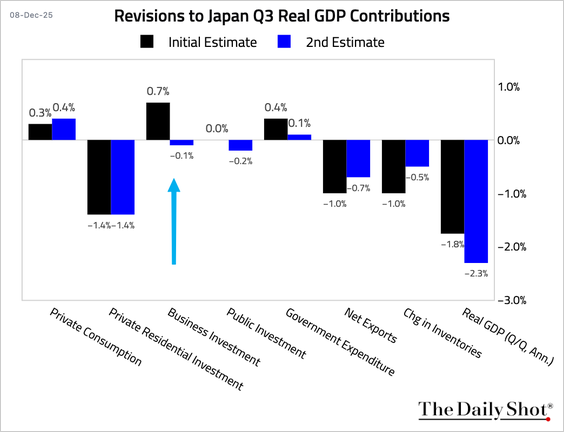 - Japan’s Q3 GDP was revised down to a contraction of 2.3% (annualized) from a preliminary estimate of -1.8%, missing consensus.