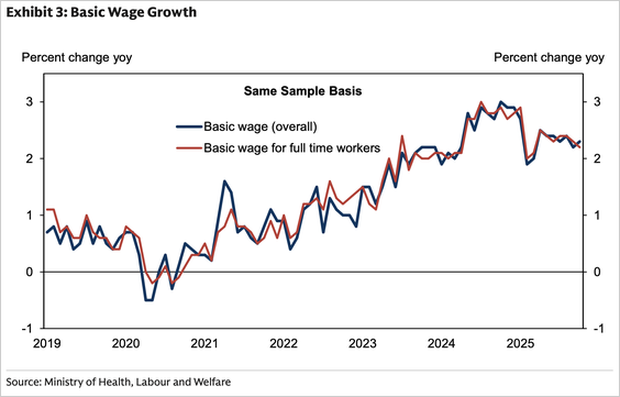 However, a key metric for the Bank of Japan—the “same sample” basic wage for full-time workers—slowed slightly to 2.2% Y/Y from 2.3%, suggesting underlying wage pressure may be less robust than the headline figure implies.
