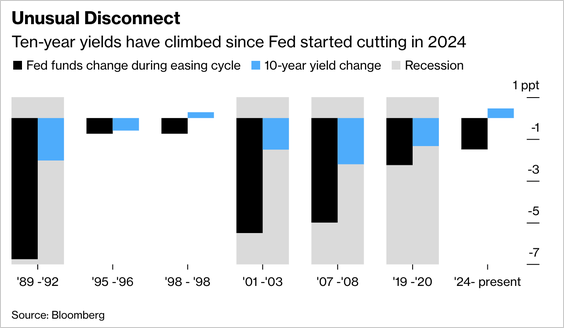 Bond yields have risen despite 150 bps of Fed rate cuts, reflecting concerns over elevated inflation, growing term premiums, and expanding federal deficits.