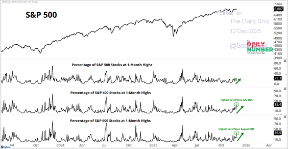 - Breadth is improving, with the share of stocks hitting one-month highs rising across size groups.