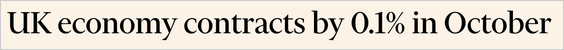 - GDP unexpectedly contracted by 0.1% month over month in October, missing consensus and marking the second consecutive monthly decline, with business uncertainty ahead of the Autumn Budget cited as a headwind.