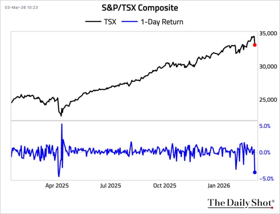 1. The S&P/TSX Composite continues downward.